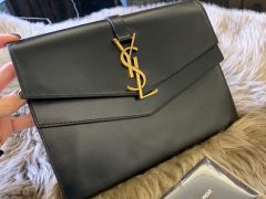 包包配以真皮鏈條肩帶,可折疊作為單肩包使用,飾以真皮包覆的 YSL 標誌。