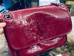 聖羅蘭包包 YSL NIKI 迷你鱷魚紋酒红色漆皮包