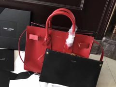 聖羅蘭YSL經典小號SAC DE JOUR和红色皮革手袋,經典SAINT LAURENT小牛皮手袋,再生皮革襯裡,採用對比邊、管狀手柄、側面手風琴式皺褶、鬆緊調節皮帶附吊牌、鐫刻SAINT LAURENT標誌及可拆卸肩帶。