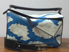 loewe羅意威 Puzzle Bag 藍天白雲圖案 進口西班牙小牛皮紡織內襯通過精密切割使它可自然摺疊出各種形狀多種用法深得眾多明星時尚博主的喜愛。展示最新版本的品牌經典包款Puzzle Bag,呈現印於小牛皮革上、吸睛的藍天白雲圖案之餘,也同時強調此包款多面幾何的獨特結構。第三張形象照,取自Steven Meisel全新獨家藝術攝影系列《Compositions》,利用透明桌面及藍天白雲畫作背景,營造出懸浮於天空般引人注目的視覺效果,呈現介乎於超現實和超寫實之間的錯視藝術。