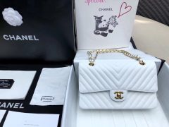 香奈兒V型口蓋包 Classic Flap Bag 冰雪白色小牛皮V型車縫線 金色金屬