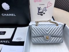 香奈兒V型鏈條經典口蓋包 Classic Flap Bag 藏蓝色小牛皮V型車縫線 银色金屬
