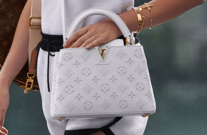 第二款同樣經過精心制作:Capucines手袋的白色皮革經過打孔,然後以Monogram花卉裝飾點綴,創造出馬德拉刺繡的圖案。美麗的外型令人聯想到Nicolas Ghesquière成衣系列中作品完美無瑕的剪裁輪廓。