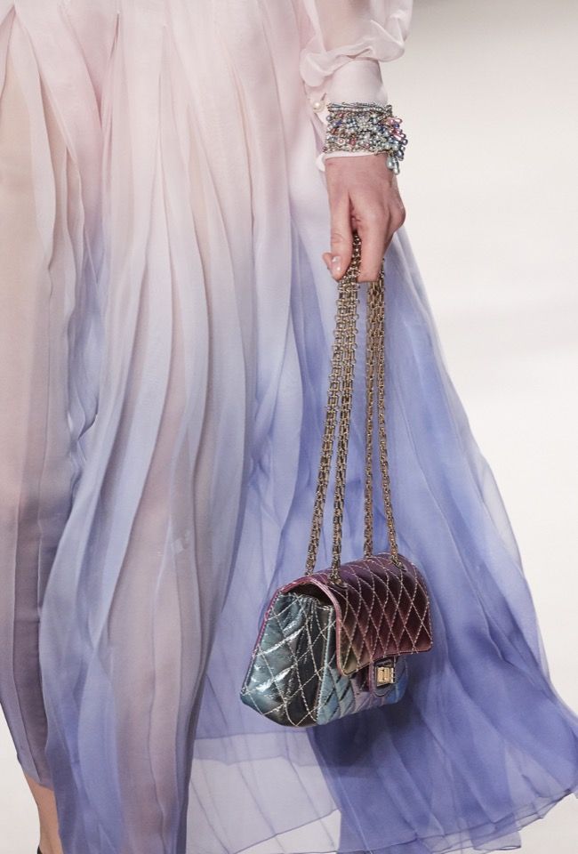 在2026 工艺坊系列上,Chanel 渐变色2.55 手袋衬上雪纺裙设计,更具诗情画意。