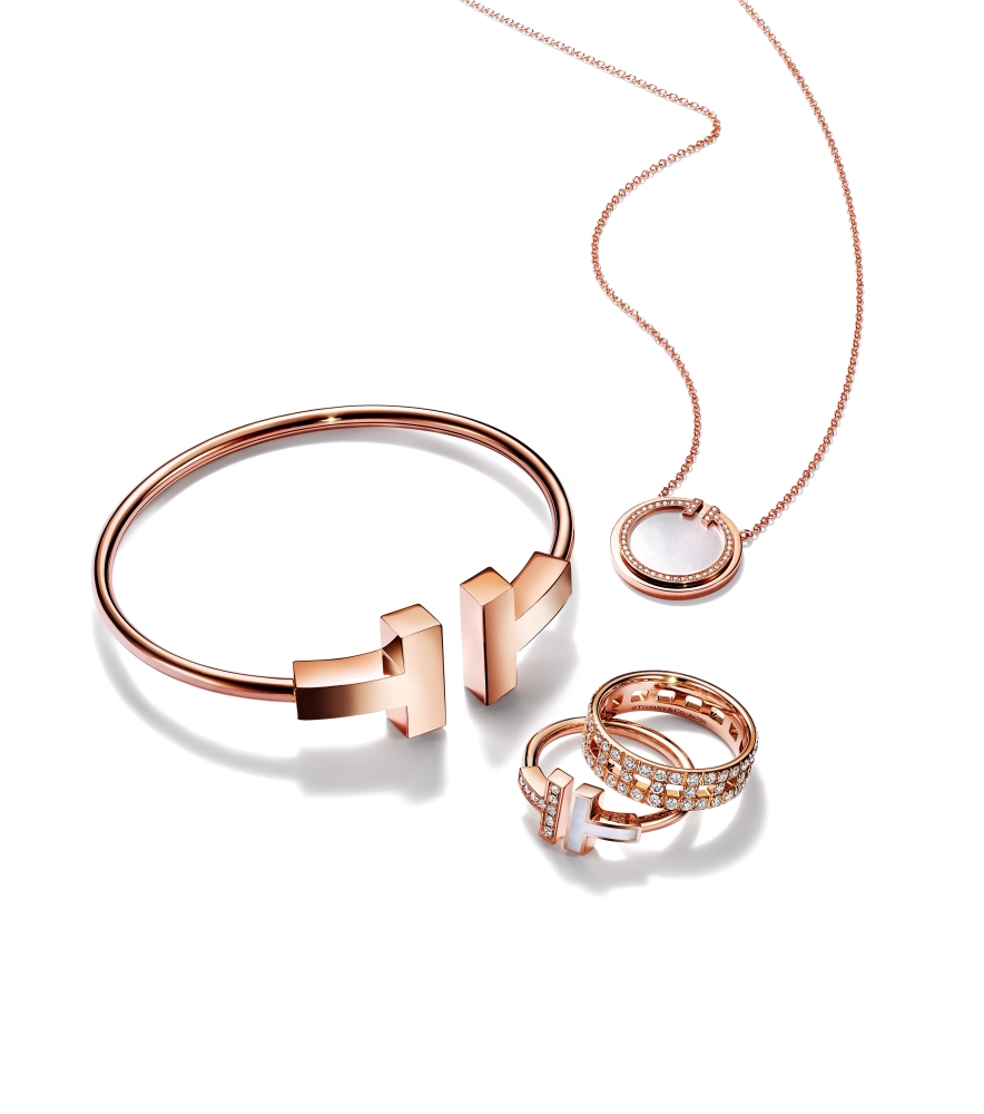 Tiffany T系列18K玫瑰金作品(由上至下)T Two镶嵌钻石与珍珠母贝链坠19,000元、T Wire宽版手环22,000元,T True钻戒46,000元,T Wire镶嵌钻石与珍珠母贝戒13,00元。