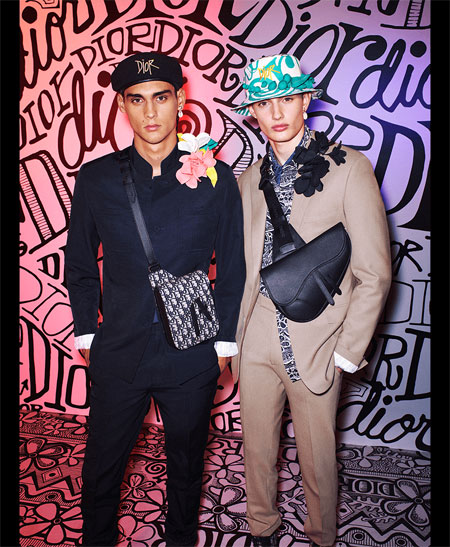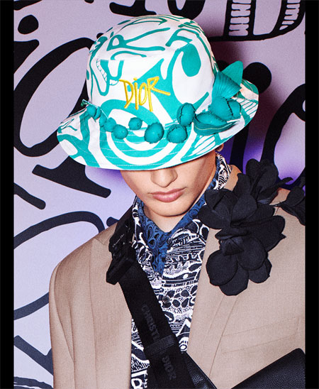 由迪奥制帽大师斯蒂芬·琼斯(STEPHENJONES)设计的贝雷帽和鱼夫帽,缀以颜色鲜明的花枝,呈现浓郁的水手风格。迪奥男装配饰设计总监YOONAHN设计的珠宝配饰经过焕新演绎,亦彰显斯图西独特的个性巧思。