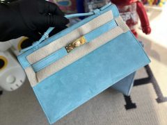 臺灣臺中市北區愛馬仕晚宴手拿包 Hermes Mini Kelly Pochette 22cm Doblis Suede 麂皮 J7 blue lin 亞麻藍 金扣 全手工蜜蠟線縫製 客定出