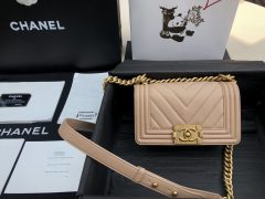 香奈兒Chane 小號LE BOY 口蓋包 杏色 GR小牛皮 V型車縫線