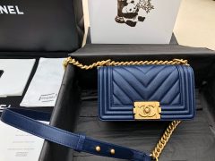 香奈兒Chane 小號BOY 口蓋包 海軍藍色顆粒壓花小牛皮V型車縫線