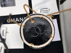 香奈兒2019最新款包包 圓形小手袋 黑與白皺紋小牛皮、棉與金色金屬