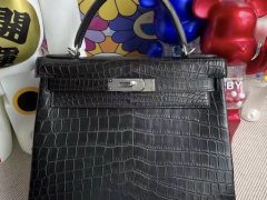Britain Hermes Kelly 28cm 霧面方塊 美洲鱷魚 89 Noir 黑色 銀扣