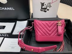 香奈兒手袋 GABRIELLE流浪包 玫紅色 V型車縫線 復古小牛皮 銀與金色金屬