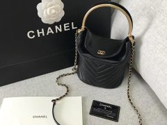 小香 黑色水桶包 手提鏈條單肩包 進口黑色羊皮革與金色金屬