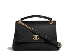 香奈兒2018春夏款口盖包Flap bag 颗粒压花黑色小牛皮 锦蛇皮与金色金属