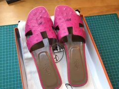 愛馬仕Hermes女士涼鞋 H型拖鞋 鴕鳥皮 E5 Rose Tyrien糖果粉色平底涼拖鞋
