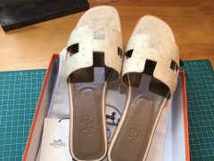 愛馬仕Hermes女士涼鞋 H型拖鞋 鴕鳥皮 3C Parchemin 綿羊白平底涼拖鞋