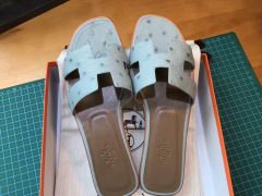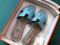 愛馬仕Hermes女士涼鞋 H型拖鞋 鴕鳥皮 3P Blue Atoll 馬卡龍藍平底涼拖鞋