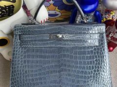 Hermes Kelly 32cm 75 Blue Jean 牛仔藍 亮面倒V 澳洲灣鱷 銀扣