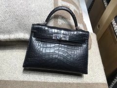 Hermes凱莉包迷妳手提包 Mini kelly二代crocodile matt黑色霧面 銀扣方塊鱷魚